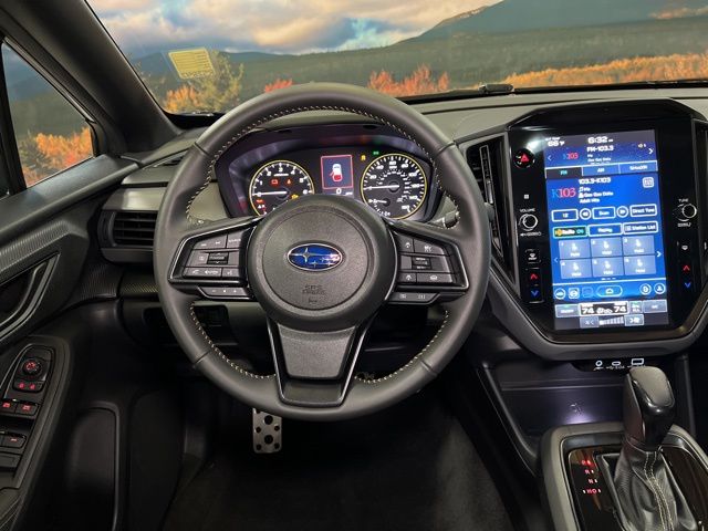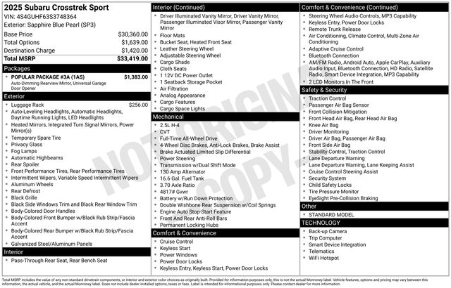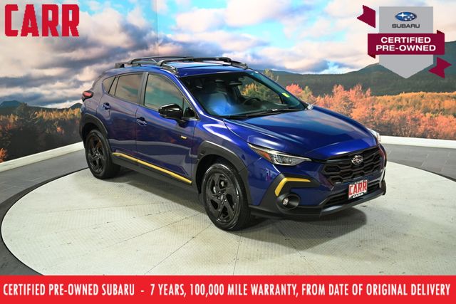 This 2025 Sapphire Blue Pearl Subaru Crosstrek Sport AWD is well equipped and includes these features and benefits: Popular Package #3A (Auto-Dimming Exterior Mirror w/Approach Light, Auto-Dimming Mirror w/Compass & HomeLink, LED Upgrade, Rear Bumper Cover, and Rear Seatback Protector), Standard Model, Subaru Certified Pre-Owned Certified, 4-Wheel Disc Brakes, 6 Speakers, ABS brakes, Active Cruise Control, Aero Crossbar Set, Air Conditioning, Alloy wheels, AM/FM radio: SiriusXM, Anti-whiplash front head restraints, Auto High-beam Headlights, Automatic temperature control, Brake assist, Bumpers: body-color, Cargo Cover, Driver door bin, Driver vanity mirror, Dual front impact airbags, Dual front side impact airbags, Electronic Stability Control, Emergency communication system, Exterior Parking Camera Rear, Four wheel independent suspension, Front anti-roll bar, Front Bucket Seats, Front Center Armrest, Front dual zone A/C, Front fog lights, Front reading lights, Fully automatic headlights, Heated door mirrors, Heated Front Bucket Seats, Heated front seats, Illuminated entry, Knee airbag, Leather Shift Knob, Leather steering wheel, Low tire pressure warning, Occupant sensing airbag, Outside temperature display, Overhead airbag, Overhead console, Panic alarm, Passenger door bin, Passenger vanity mirror, Power door mirrors, Power steering, Power windows, Radio data system, Radio: Subaru 11.6" Multimedia Plus System, Rear anti-roll bar, Rear seat center armrest, Rear window defroster, Rear window wiper, Remote keyless entry, Security system, Speed control, Speed-sensing steering, Split folding rear seat, Spoiler, Sport Cloth Upholstery, Steering wheel mounted audio controls, Tachometer, Telescoping steering wheel, Tilt steering wheel, Traction control, Trip computer, Turn signal indicator mirrors, Variably intermittent wipers, Wheels: 18" x 7.0" J Dark Gray Aluminum-Alloy, and Wireless Charger (DIO)