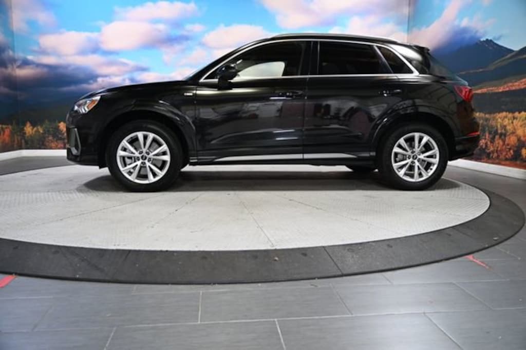 This 2023 Mythos Black Metallic Audi Q3 Premium AWD is well equipped and includes these features and benefits: 10 Speakers, 3.533 Axle Ratio, 4-Wheel Disc Brakes, ABS brakes, Air Conditioning, Alloy wheels, AM/FM radio, Audi smartphone interface (Apple CarPlay/Android Auto), Auto High-beam Headlights, Automatic temperature control, Brake assist, Bumpers: body-color, Delay-off headlights, Driver door bin, Driver Seat Memory, Driver vanity mirror, Dual front impact airbags, Dual front side impact airbags, Electronic Stability Control, Emergency communication system: Audi connect CARE, Exterior Parking Camera Rear, Four wheel independent suspension, Front anti-roll bar, Front Bucket Seats, Front Center Armrest, Front dual zone A/C, Front reading lights, Fully automatic headlights, Heated door mirrors, Heated Front Bucket Seats, Heated front seats, Illuminated entry, Knee airbag, Leather Seating Surfaces, Leather Shift Knob, Leather steering wheel, Low tire pressure warning, Occupant sensing airbag, Outside temperature display, Overhead airbag, Overhead console, Panic alarm, Passenger door bin, Passenger vanity mirror, Power door mirrors, Power driver seat, Power Liftgate, Power moonroof: Panoramic, Power passenger seat, Power steering, Power windows, Radio data system, Radio: Audi Sound System, Rain sensing wipers, Rear air conditioning, Rear anti-roll bar, Rear reading lights, Rear seat center armrest, Rear window defroster, Rear window wiper, Remote keyless entry, SiriusXM w/360L, Speed control, Speed-sensing steering, Split folding rear seat, Spoiler, Steering wheel mounted audio controls, Tachometer, Telescoping steering wheel, Tilt steering wheel, Traction control, Trip computer, Turn signal indicator mirrors, Variably intermittent wipers, and Wheels: 18 5-V-Spoke-S Design.