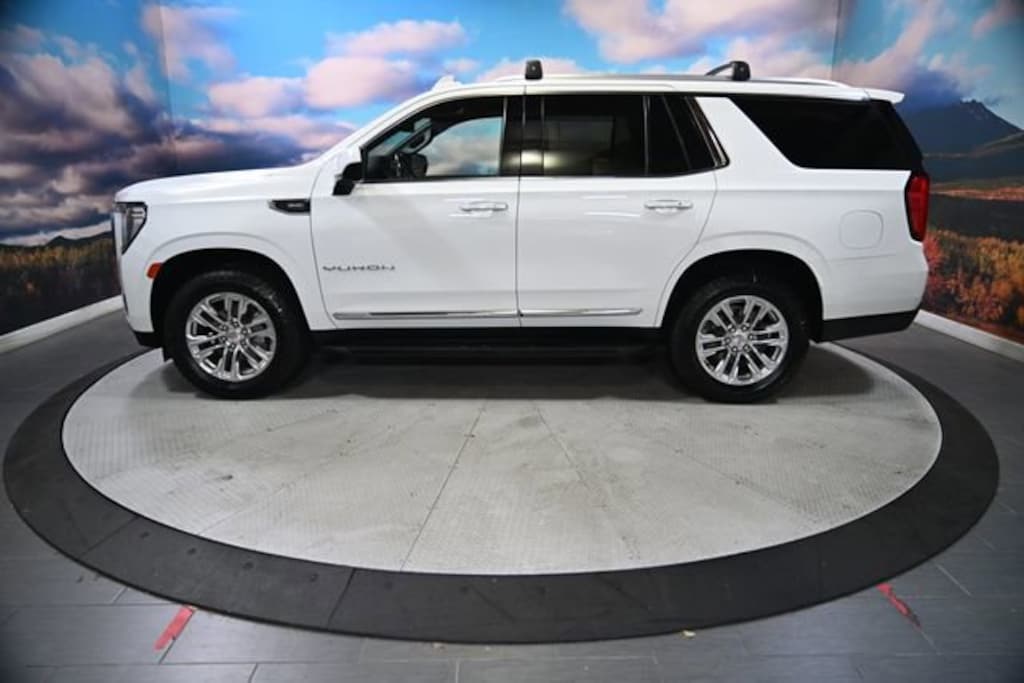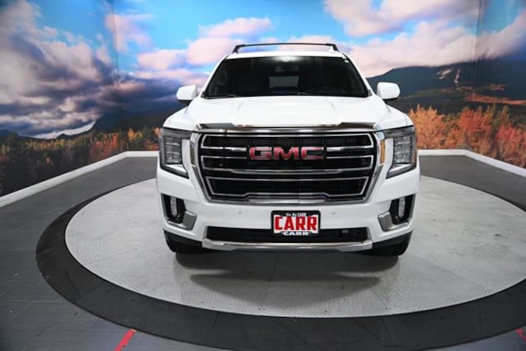 This 2021 Summit White GMC Yukon SLT 4WD is well equipped and includes these features and benefits: License Plate Front Mounting Package, Preferred Equipment Group 4SA (12-Way Power Seat Adjusters, 2 Presets For Power Driver Seat, Bose 9-Speaker Stereo Audio System Feature, Bright Chrome Bodyside Moldings, Bright Front & Rear Door Sill Plates, Chrome Door Handles w/Body-Color Strip, Hands-Free Power Programmable Rear Liftgate, Heated & Ventilated Driver & Front Passenger Seats, Heated Driver & Front Passenger Seats, Inside Rear-View Auto-Dimming Mirror, Safety Alert Seat, and Universal Home Remote), 4WD, 3.23 Rear Axle Ratio, 3rd row seats: split-bench, 4-Wheel Disc Brakes, 9 Speakers, ABS brakes, Air Conditioning, Alloy wheels, AM/FM radio: SiriusXM with 360L, Apple CarPlay/Android Auto, Auto High-beam Headlights, Auto-dimming Rear-View mirror, Automatic Emergency Braking, Automatic temperature control, Black Roof Rack Cross Rails, Bodyside moldings, Brake assist, Bumpers: body-color, Compass, Delay-off headlights, Driver door bin, Driver vanity mirror, Dual front impact airbags, Dual front side impact airbags, Electronic Stability Control, Emergency communication system: OnStar and GMC connected services capable, Following Distance Indicator, Forward Collision Alert, Four wheel independent suspension, Front & Rear Park Assist, Front anti-roll bar, Front Bucket Seats, Front Center Armrest, Front dual zone A/C, Front fog lights, Front Pedestrian Braking, Front reading lights, Fully automatic headlights, Garage door transmitter, HD Radio, Heated door mirrors, Heated front seats, Illuminated entry, IntelliBeam Automatic High Beam On/Off, Lane Change Alert w/Side Blind Zone Alert, Lane Keep Assist w/Lane Departure Warning, Leather steering wheel, Low tire pressure warning, Memory seat, Occupant sensing airbag, Outside temperature display, Overhead airbag, Overhead console, Panic alarm, Passenger door bin, Passenger vanity mirror, Perforated Leather Seating Surfaces, Power door mirrors, Power driver seat, Power Liftgate, Power passenger seat, Power steering, Power windows, Premium Smooth Ride Suspension, Radio: AM/FM/SiriusXM, Rain sensing wipers, Rear air conditioning, Rear anti-roll bar, Rear Cross Traffic Alert, Rear reading lights, Rear seat center armrest, Rear window defroster, Rear window wiper, Remote keyless entry, Roof rack: rails only, Security system, SiriusXM w/360L, Speed control, Speed-sensing steering, Split folding rear seat, Spoiler, Steering wheel mounted audio controls, Tachometer, Telescoping steering wheel, Tilt steering wheel, Traction control, Trip computer, Variably intermittent wipers, Ventilated front seats, Voltmeter, and Wheels: 20 x 9 6-Spoke Polished Aluminum.