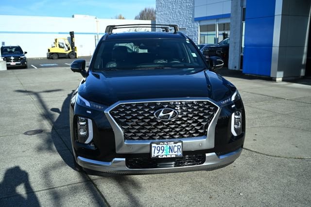 This 2022 Abyss Black Pearl Hyundai Palisade Calligraphy AWD is well equipped and includes these features and benefits: Cargo Package, Option Group 01, 12 Speakers, 3.648 Axle Ratio, 3rd row seats: split-bench, 4-Wheel Disc Brakes, ABS brakes, Active Cruise Control, Air Conditioning, Alloy wheels, AM/FM radio: SiriusXM, Apple CarPlay & Android Auto, Auto High-beam Headlights, Auto-dimming Rear-View mirror, Auto-leveling suspension, Automatic temperature control, Brake assist, Bumpers: body-color, Cargo Cover/Screen, Delay-off headlights, Driver door bin, Driver vanity mirror, Dual front impact airbags, Dual front side impact airbags, Electronic Stability Control, Emergency communication system: Blue Link Connected Car Service (3-year complimentary subscription), Four wheel independent suspension, Front anti-roll bar, Front Bucket Seats, Front Center Armrest, Front dual zone A/C, Front reading lights, Fully automatic headlights, Garage door transmitter: HomeLink, harman/kardon® Speakers, Heads-Up Display, Heated & Ventilated Front Bucket Seats, Heated door mirrors, Heated front seats, Heated rear seats, Heated steering wheel, Illuminated entry, Knee airbag, Low tire pressure warning, Memory seat, Mudguards, Navigation System, Occupant sensing airbag, Outside temperature display, Overhead airbag, Overhead console, Panic alarm, Passenger door bin, Passenger vanity mirror, Power door mirrors, Power driver seat, Power Liftgate, Power moonroof, Power passenger seat, Power steering, Power windows, Premium Nappa Leather Seat Trim, Radio data system, Radio: AM/FM/MP3 Premium Audio System, Rain sensing wipers, Rear air conditioning, Rear anti-roll bar, Rear audio controls, Rear reading lights, Rear window defroster, Rear window wiper, Reclining 3rd row seat, Remote keyless entry, Security system, Speed control, Speed-sensing steering, Split folding rear seat, Spoiler, Steering wheel mounted audio controls, Tachometer, Telescoping steering wheel, Tilt steering wheel, Traction control, Trip computer, Turn signal indicator mirrors, Variably intermittent wipers, Ventilated front seats, Ventilated rear seats, Wheel Locks, and Wheels: 20 x 7.5J Calligraphy Exclusive Alloy.