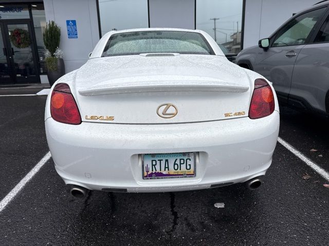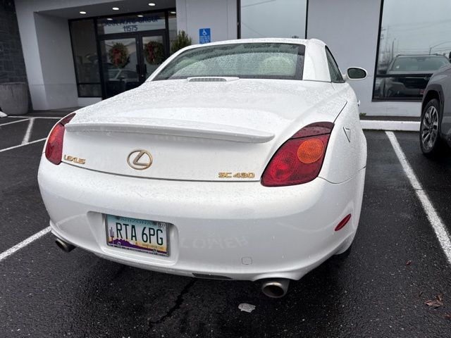 This 2002 White Lexus SC 430 RWD is well equipped and includes these features and benefits: Saddle Tan Leather, 18" x 8" Polished Alloy Wheels, 4-Wheel Disc Brakes, 9 Speakers, ABS brakes, Air Conditioning, Alloy wheels, AM/FM radio, Auto tilt-away steering wheel, Auto-dimming door mirrors, Auto-dimming Rear-View mirror, Automatic temperature control, Brake assist, Bumpers: body-color, Cassette, CD player, Compass, Convertible HardTop, Convertible roof lining, Convertible roof wind blocker, Delay-off headlights, Driver door bin, Driver vanity mirror, Dual front impact airbags, Dual front side impact airbags, Electronic Stability Control, Four wheel independent suspension, Front anti-roll bar, Front Bucket Seats, Front Center Armrest w/Storage, Front dual zone A/C, Front fog lights, Front reading lights, Fully automatic headlights, Garage door transmitter: Homelink, Genuine wood console insert, Genuine wood dashboard insert, Genuine wood door panel insert, Glass rear window, Headlight cleaning, Heated door mirrors, Heated front seats, High-Intensity Discharge Headlights, Illuminated entry, Integrated roll-over protection, Leather Seat Trim, Leather steering wheel, Low tire pressure warning, Mark Levinson Premium Audio System, Memory seat, Navigation System, Occupant sensing airbag, Outside temperature display, Panic alarm, Passenger door bin, Passenger vanity mirror, Power convertible roof, Power door mirrors, Power driver seat, Power passenger seat, Power steering, Power windows, Radio data system, Rear anti-roll bar, Rear window defroster, Remote keyless entry, Security system, Speed control, Speed-sensing steering, Speed-Sensitive Wipers, Steering wheel memory, Steering wheel mounted audio controls, Tachometer, Telescoping steering wheel, Tilt steering wheel, Traction control, Trip computer, Variably intermittent wipers, and Voltmeter. Saddle Tan Leather.
