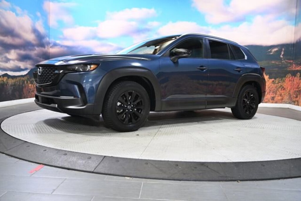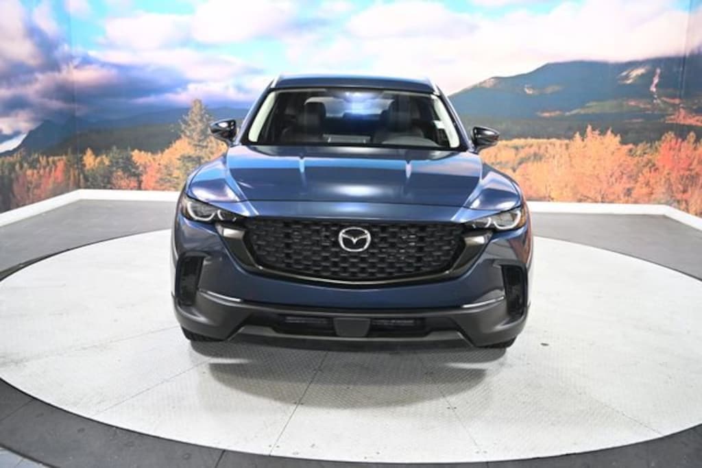 This 2024 Ingot Blue Metallic Mazda CX-50 2.5 S Preferred Package AWD is well equipped and includes these features and benefits: 4-Wheel Disc Brakes, 8 Speakers, ABS brakes, Air Conditioning, Alloy wheels, AM/FM radio, AppLink/Apple CarPlay and Android Auto, Auto High-beam Headlights, Automatic temperature control, Brake assist, Bumpers: body-color, Delay-off headlights, Driver door bin, Driver vanity mirror, Dual front impact airbags, Dual front side impact airbags, Electronic Stability Control, Emergency communication system: MAZDA CONNECT, Exterior Parking Camera Rear, Front anti-roll bar, Front Bucket Seats, Front Center Armrest, Front dual zone A/C, Front reading lights, Front wheel independent suspension, Fully automatic headlights, Half Leatherette Seat Trim, Heated door mirrors, Heated Front Bucket Seats, Heated front seats, Illuminated entry, Knee airbag, Leather Shift Knob, Leather steering wheel, Low tire pressure warning, Occupant sensing airbag, Outside temperature display, Overhead airbag, Overhead console, Panic alarm, Passenger door bin, Passenger vanity mirror, Power door mirrors, Power driver seat, Power Liftgate, Power steering, Power windows, Radio data system, Radio: AM/FM/HD Audio System, Rain sensing wipers, Rear seat center armrest, Rear window defroster, Rear window wiper, Remote keyless entry, Speed control, Speed-sensing steering, Split folding rear seat, Spoiler, Steering wheel mounted audio controls, Tachometer, Telescoping steering wheel, Tilt steering wheel, Traction control, Trip computer, Turn signal indicator mirrors, Variably intermittent wipers, and Wheels: 17 x 7J Aluminum Alloy.