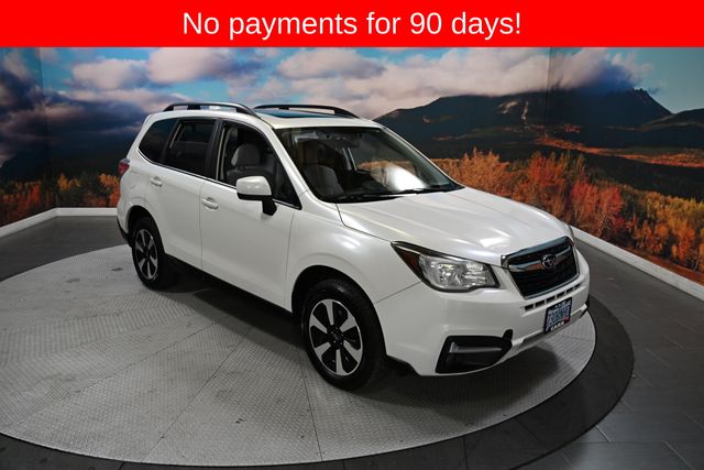 This 2018 Crystal White Pearl Subaru Forester 2.5i Premium AWD is well equipped and includes these features and benefits: 3.70 Axle Ratio, 4-Wheel Disc Brakes, 6 Speakers, ABS brakes, Air Conditioning, Alloy wheels, AM/FM radio: SiriusXM, Automatic temperature control, Brake assist, Bumpers: body-color, Cargo Cover - Manual Rear Gate, CD player, Driver door bin, Driver vanity mirror, Dual front impact airbags, Dual front side impact airbags, Electronic Stability Control, Emergency communication system: STARLINK, Exterior Parking Camera Rear, Four wheel independent suspension, Front anti-roll bar, Front Bucket Seats, Front Center Armrest, Front reading lights, Illuminated entry, Knee airbag, Low tire pressure warning, Occupant sensing airbag, Outside temperature display, Overhead airbag, Overhead console, Panic alarm, Passenger door bin, Passenger vanity mirror, Power door mirrors, Power driver seat, Power moonroof, Power steering, Power windows, Radio data system, Radio: Subaru Starlink 7.0" Multimedia Plus System, Rear anti-roll bar, Rear seat center armrest, Rear window defroster, Rear window wiper, Remote keyless entry, Roof rack: rails only, Security system, Speed control, Split folding rear seat, Spoiler, Steering wheel mounted audio controls, Tachometer, Telescoping steering wheel, Tilt steering wheel, Traction control, Trip computer, and Variably intermittent wipers. No CARR payments for 90 days, Sign and Drive sales event!, Great value AWD Subaru.