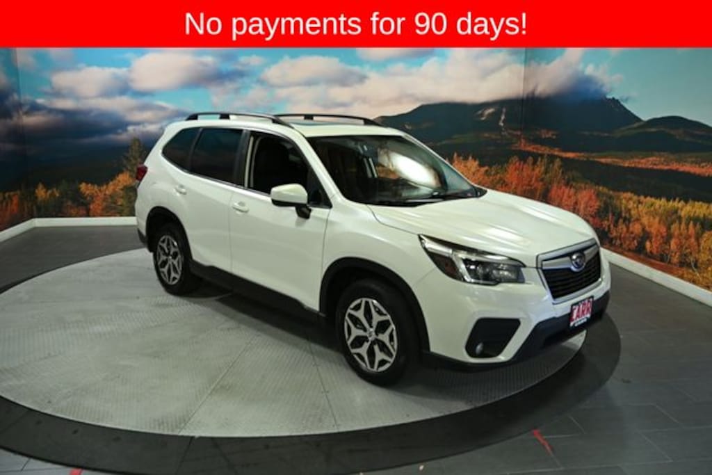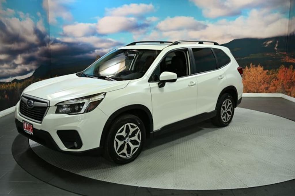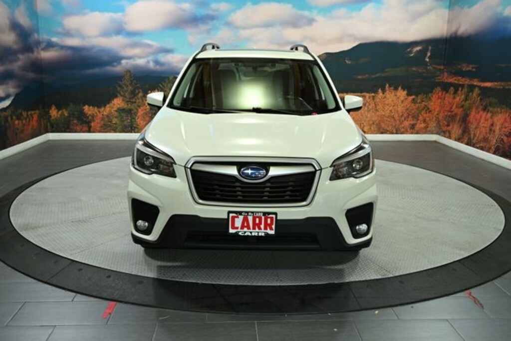 This 2021 Crystal White Pearl Subaru Forester Premium AWD is well equipped and includes these features and benefits: Standard Model, Power moonroof: Panoramic, 3.70 Axle Ratio, 4-Wheel Disc Brakes, 6 Speakers, ABS brakes, Air Conditioning, All-Weather Floor Liners, Alloy wheels, AM/FM radio: SiriusXM, Auto High-beam Headlights, Automatic temperature control, Brake assist, Bumpers: body-color, CD player, Cloth Upholstery, Driver door bin, Driver vanity mirror, Dual front impact airbags, Dual front side impact airbags, Electronic Stability Control, Emergency communication system: STARLINK Safety and Security (Subscription Required), Exterior Parking Camera Rear, Four wheel independent suspension, Front anti-roll bar, Front Bucket Seats, Front Center Armrest, Front fog lights, Front reading lights, Fully automatic headlights, Heated door mirrors, Heated Front Bucket Seats, Heated front seats, Illuminated entry, Knee airbag, Low tire pressure warning, Occupant sensing airbag, Outside temperature display, Overhead airbag, Overhead console, Panic alarm, Passenger door bin, Passenger vanity mirror, Power door mirrors, Power driver seat, Power steering, Power windows, Radio data system, Radio: Subaru Starlink 6.5" Multimedia Plus System, Rear anti-roll bar, Rear seat center armrest, Rear window defroster, Rear window wiper, Remote keyless entry, Roof rack: rails only, Security system, Speed control, Speed-sensing steering, Split folding rear seat, Spoiler, STARLINK/Apple CarPlay/Android Auto, Steering wheel mounted audio controls, Tachometer, Telescoping steering wheel, Tilt steering wheel, Traction control, Trip computer, Variably intermittent wipers, and Wheels: 17" x 7.0J Black Machine Finish Alloy. No CARR payments for 4 months, Sign and Drive sales event!, CARR Cares Advantage up to $3100 in ownership savings, Panoramic moonroof, Power moonroof: Panoramic.