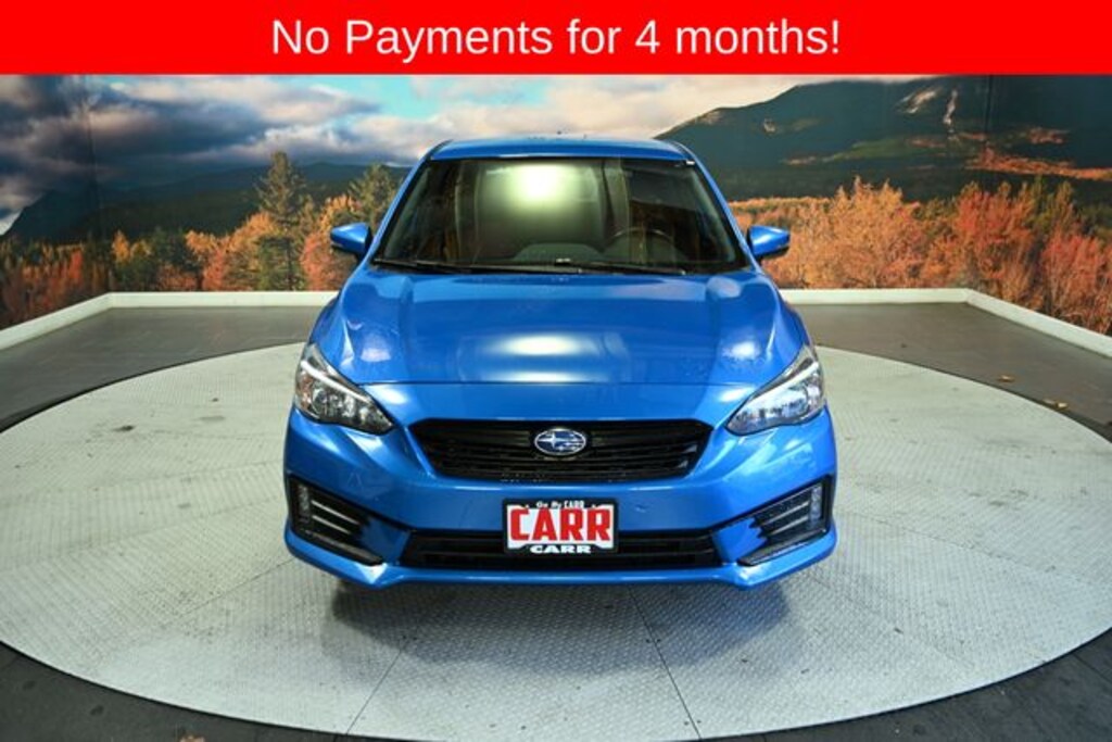 This 2021 Ocean Blue Pearl Subaru Impreza Sport AWD is well equipped and includes these features and benefits: Standard Model, 4-Wheel Disc Brakes, 6 Speakers, ABS brakes, Aero Splash Guards, Air Conditioning, All-Weather Floor Liners, Alloy wheels, AM/FM radio: SiriusXM, Anti-whiplash front head restraints, Auto-Dimming Exterior Mirror w/Approach Light, Auto-Dimming Mirror w/Compass & HomeLink, Brake assist, Bumpers: body-color, Cargo Net, Cargo Tray, CD player, Delay-off headlights, Driver door bin, Driver vanity mirror, Driver's Side Mirror - Bulk, Dual front impact airbags, Dual front side impact airbags, Electronic Stability Control, Emergency communication system, Exterior Mirror Hardware Kit, Exterior Parking Camera Rear, Four wheel independent suspension, Front anti-roll bar, Front Bucket Seats, Front Center Armrest, Front reading lights, Fully automatic headlights, Heated door mirrors, Heated Front Bucket Seats, Heated front seats, Illuminated entry, Knee airbag, Leather Shift Knob, Low tire pressure warning, Occupant sensing airbag, Outside temperature display, Overhead airbag, Overhead console, Panic alarm, Passenger door bin, Passenger vanity mirror, Passenger's Side Mirror - Bulk, Power door mirrors, Power steering, Power windows, Radio data system, Radio: Subaru STARLINK 8.0" Multimedia Plus System, Rear anti-roll bar, Rear window defroster, Rear window wiper, Remote keyless entry, Security system, Speed control, Speed-sensing steering, Split folding rear seat, Spoiler, Sport-Trimmed Upholstery, STARLINK/Apple CarPlay/Android Auto, Steering wheel mounted audio controls, Tachometer, Telescoping steering wheel, Tilt steering wheel, Traction control, Trip computer, Turn signal indicator mirrors, Variably intermittent wipers, and Wheels: 18" x 7.5" Machine Finish J Aluminum-Alloy. No CARR payments for 4 months, Sign and Drive sales event!, CARR Cares Advantage up to $3100 in ownership savings.