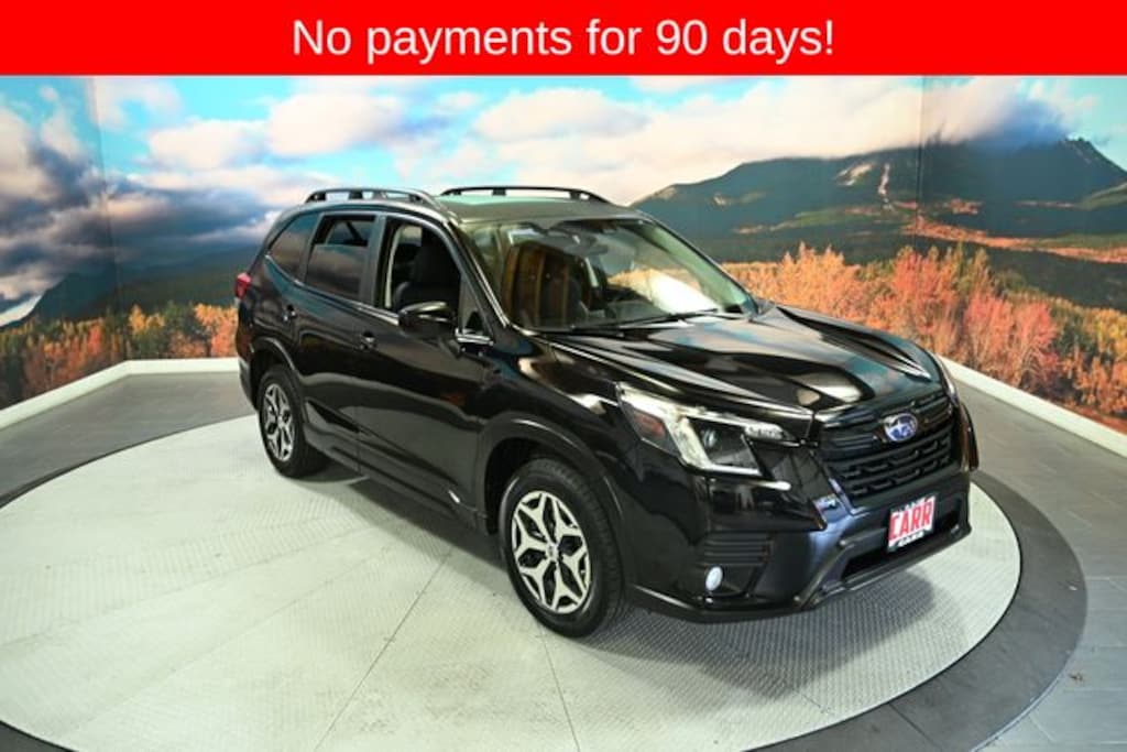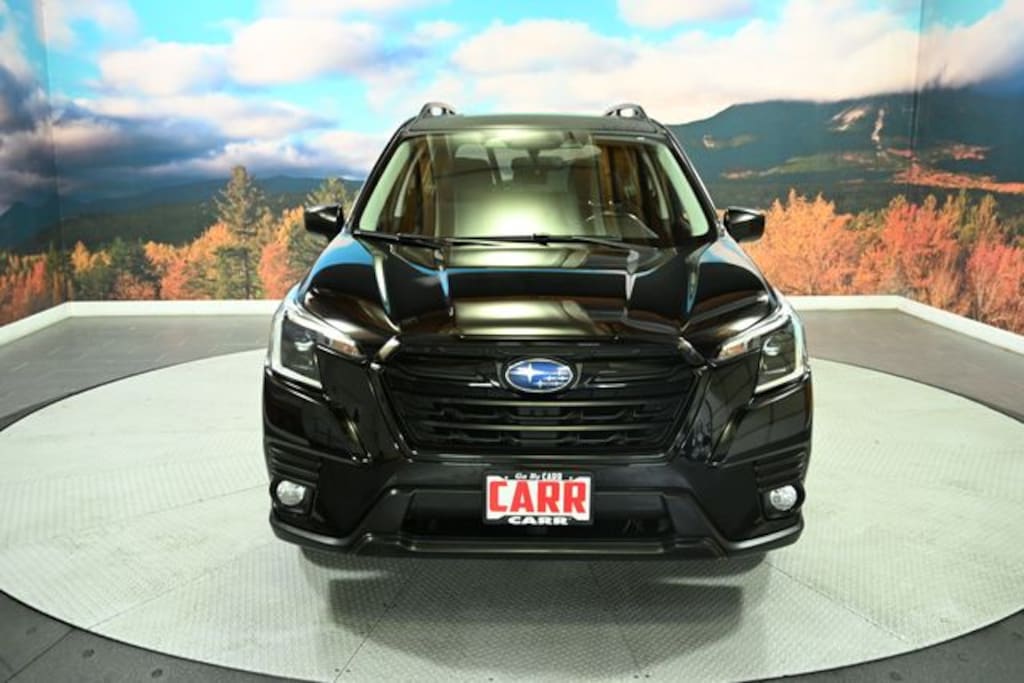 This 2022 Crystal Black Silica Subaru Forester Premium AWD is well equipped and includes these features and benefits: Blind Spot Detection w/RCTA & Power Rear Gate (Blind Spot Detection (BSD), Driver's Seatback Divided Pocket, Dual USB Charge Ports, EyeSight System, Multi-Function High Grade Display, and Power Rear Gate), Power moonroof: Panoramic, 3.70 Axle Ratio, 4-Wheel Disc Brakes, 6 Speakers, ABS brakes, Air Conditioning, All-Weather Floor Liners, Alloy wheels, AM/FM radio: SiriusXM, Anti-whiplash front head restraints, Auto High-beam Headlights, Automatic temperature control, Brake assist, Bumpers: body-color, CD player, Driver door bin, Driver vanity mirror, Dual front impact airbags, Dual front side impact airbags, Electronic Stability Control, Emergency communication system: STARLINK Safety and Security (Subscription Required), Exterior Parking Camera Rear, Four wheel independent suspension, Front anti-roll bar, Front Bucket Seats, Front Center Armrest, Front fog lights, Front reading lights, Fully automatic headlights, Heated door mirrors, Heated Front Bucket Seats, Heated front seats, Illuminated entry, Knee airbag, Low tire pressure warning, Occupant sensing airbag, Outside temperature display, Overhead airbag, Overhead console, Panic alarm, Passenger door bin, Passenger vanity mirror, Power door mirrors, Power driver seat, Power steering, Power windows, Premium Cloth Upholstery, Radio data system, Radio: Subaru Starlink 6.5" Multimedia Plus System, Rear anti-roll bar, Rear seat center armrest, Rear window defroster, Rear window wiper, Remote keyless entry, Roof rack: rails only, Security system, Speed control, Speed-sensing steering, Split folding rear seat, Spoiler, STARLINK/Apple CarPlay/Android Auto, Steering wheel mounted audio controls, Tachometer, Telescoping steering wheel, Tilt steering wheel, Traction control, Trip computer, Variably intermittent wipers, and Wheels: 17" x 7.0J Black Machine Finish Alloy. No CARR payments for 4 months, Sign and Drive sales event!, CARR Cares Advantage up to $3100 in ownership savings, Blind Spot Detection (BSD), Blind Spot Detection w/RCTA & Power Rear Gate, Driver's Seatback Divided Pocket, Dual USB Charge Ports, EyeSight System, Multi-Function High Grade Display, Power moonroof: Panoramic, Power Rear Gate.