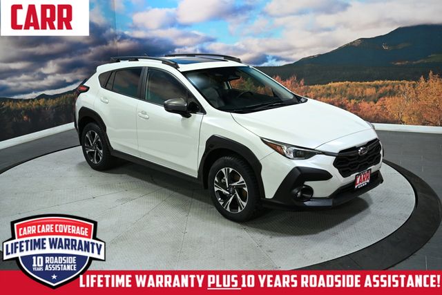 This 2024 Crystal White Pearl Subaru Crosstrek Premium AWD is well equipped and includes these features and benefits: All-Weather Package (Heated Exterior Mirrors, Heated Front Seats, and Heated Wipers), BSD/RCTA & Moonrf & All Weather Pkg & Pwr Dr. Seat (10-Way Power Driver's Seat, Blind Spot Detection w/Rear Cross-Traffic Alert, and Power Moonroof), Popular Package #4 (Auto-Dimming Exterior Mirror w/Approach Light, Auto-Dimming Mirror w/Compass & HomeLink, Rear Bumper Cover, and Splash Guards), Carr Care Advantage Certified, 3.90 Axle Ratio, 4-Wheel Disc Brakes, 6 Speakers, ABS brakes, Active Cruise Control, Air Conditioning, Alloy wheels, AM/FM radio: SiriusXM, Anti-whiplash front head restraints, Auto High-beam Headlights, Automatic temperature control, Brake assist, Bumpers: body-color, Driver door bin, Driver vanity mirror, Dual front impact airbags, Dual front side impact airbags, Electronic Stability Control, Emergency communication system: STARLINK Safety and Security (Subscription Required), Exterior Parking Camera Rear, Four wheel independent suspension, Front anti-roll bar, Front Bucket Seats, Front Center Armrest, Front dual zone A/C, Front fog lights, Front reading lights, Fully automatic headlights, Illuminated entry, Knee airbag, Low tire pressure warning, Occupant sensing airbag, Outside temperature display, Overhead airbag, Overhead console, Panic alarm, Passenger door bin, Passenger vanity mirror, Power door mirrors, Power steering, Power windows, Premium Cloth Upholstery, Radio data system, Radio: Subaru STARLINK 11.6" Multimedia Plus Sys, Rear anti-roll bar, Rear seat center armrest, Rear Seatback Protector, Rear window defroster, Rear window wiper, Remote keyless entry, Security system, Speed control, Speed-sensing steering, Split folding rear seat, Spoiler, STARLINK/Apple CarPlay/Android Auto, Steering wheel mounted audio controls, Tachometer, Telescoping steering wheel, Tilt steering wheel, Traction control, Trip computer, Turn signal indicator mirrors, Variably intermittent wipers, and Wheels: 17" x 7.0J Dark Gray Aluminum Alloy. Lifetime powertrain warranty, No CARR payments for 4 months, Sign and Drive sales event!, CARR Cares Advantage up to $3100 in ownership savings, Ask us about our lifetime powertrain warranty!, 10-Way Power Driver's Seat, All-Weather Package, Blind Spot Detection w/Rear Cross-Traffic Alert, BSD/RCTA & Moonrf & All Weather Pkg & Pwr Dr. Seat, Heated Exterior Mirrors, Heated Front Seats, Heated Wipers, Power Moonroof.