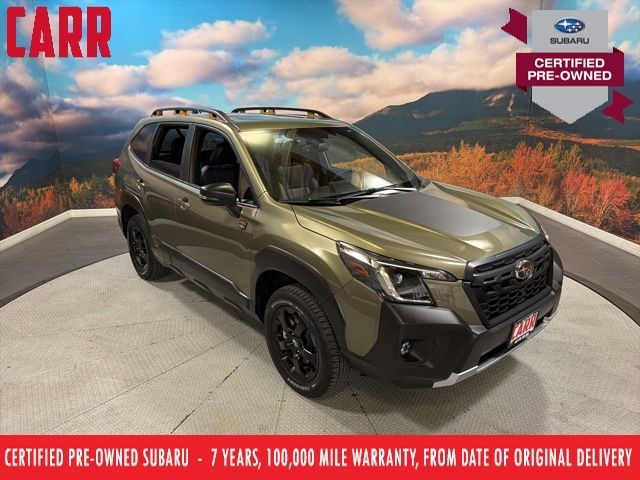 This 2024 Autumn Green Metallic Subaru Forester Wilderness AWD is well equipped and includes these features and benefits: 8" Audio w/harman/kardon & Power Rear Gate (harman/kardon 9-Speaker Audio System, Power Rear Gate, and Radio: Subaru STARLINK 8.0" Multimedia Nav System), Subaru Certified Pre-Owned Certified, 4-Wheel Disc Brakes, 4.11 Axle Ratio, 6 Speakers, ABS brakes, Air Conditioning, Alloy wheels, AM/FM radio: SiriusXM, Anti-whiplash front head restraints, Auto High-beam Headlights, Auto-Dimming Mirror w/Compass & HomeLink, Automatic temperature control, Brake assist, Bumpers: body-color, Cargo Sidewall Protector, Driver door bin, Driver vanity mirror, Dual front impact airbags, Dual front side impact airbags, Electronic Stability Control, Emergency communication system: STARLINK Safety and Security (Subscription Required), Exterior Parking Camera Rear, Four wheel independent suspension, Front anti-roll bar, Front Bucket Seats, Front Center Armrest, Front dual zone A/C, Front fog lights, Front reading lights, Fully automatic headlights, Heated door mirrors, Heated Front Bucket Seats, Heated front seats, Illuminated entry, Knee airbag, Leather Shift Knob, Leather steering wheel, Low tire pressure warning, Navigation System, Occupant sensing airbag, Outside temperature display, Overhead airbag, Overhead console, Panic alarm, Passenger door bin, Passenger vanity mirror, Power door mirrors, Power driver seat, Power moonroof: Panoramic, Power steering, Power windows, Radio data system, Radio: Subaru STARLINK 8.0" Multimedia Plus System, Rear anti-roll bar, Rear Bumper Cover, Rear seat center armrest, Rear Seatback Protector - Wilderness, Rear window defroster, Rear window wiper, Remote keyless entry, Roof rack: rails only, Security system, Speed control, Speed-sensing steering, Split folding rear seat, Spoiler, STARLINK/Apple CarPlay/Android Auto, Steering wheel mounted audio controls, Tachometer, Telescoping steering wheel, Textured StarTex Upholstery, Tilt steering wheel, Traction control, Trip computer, Turn signal indicator mirrors, Variably intermittent wipers, and Wheels: 17" x 7.0 J Matte Black Finish Alum-Alloy.