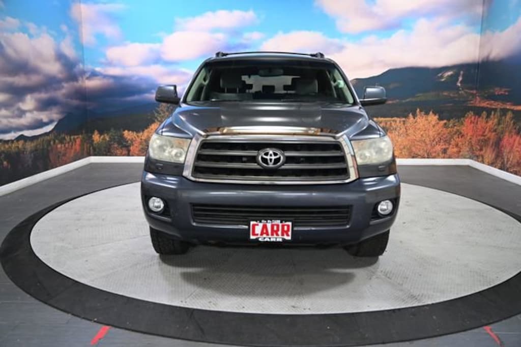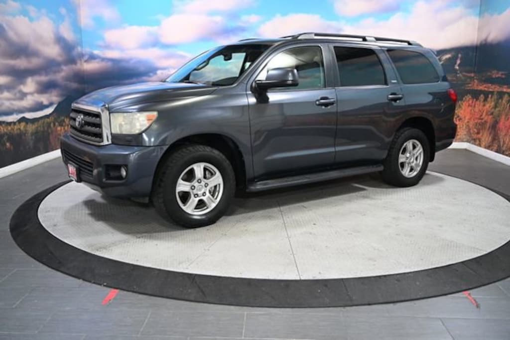 This 2008 Slate Metallic Toyota Sequoia SR5 4WD is well equipped and includes these features and benefits: 6-Speed Automatic Electronic with Overdrive, 4WD, 8-Way Power Driver Seat, DLX AM/FM In-Dash 6-Disc w/8 Speakers, Power Tilt & Slide Moonroof, 18 x 8 Silver Alloy Wheels, 3.909 Axle Ratio, 3rd row seats: split-bench, 4-Wheel Disc Brakes, 7 Pin Wire Harness for Trailer w/Converter, 8 Speakers, ABS brakes, Air Conditioning, Alloy wheels, AM/FM radio, AM/FM Stereo w/In-Dash CD/MP3, Automatic temperature control, Brake assist, Bumpers: body-color, CD player, Cloth Seat Trim, Color-Keyed Running Boards, Compass, Daytime Running Light System, Delay-off headlights, Driver door bin, Driver vanity mirror, Dual front impact airbags, Dual front side impact airbags, Electrochromic Rear-View Mirror, Electronic Stability Control, Four wheel independent suspension, Front anti-roll bar, Front Bucket Seats, Front Center Armrest, Front dual zone A/C, Front Fog & Driving Lamp, Front reading lights, Fully automatic headlights, Illuminated entry, Leather Shift Knob, Leather steering wheel, Low tire pressure warning, Occupant sensing airbag, Outside temperature display, Overhead airbag, Overhead console, Panic alarm, Passenger door bin, Passenger vanity mirror, Power door mirrors, Power steering, Power windows, Rear air conditioning, Rear anti-roll bar, Rear reading lights, Rear seat center armrest, Rear window defroster, Rear window wiper, Rear-Seat DVD Entertainment System, Reclining 3rd row seat, Remote keyless entry, Roof Rack w/Roof Rails, Security system, Speed control, Speed-sensing steering, Split folding rear seat, Tachometer, Telescoping steering wheel, Tilt steering wheel, Towing Hitch, Traction control, Variably intermittent wipers, and Voltmeter.