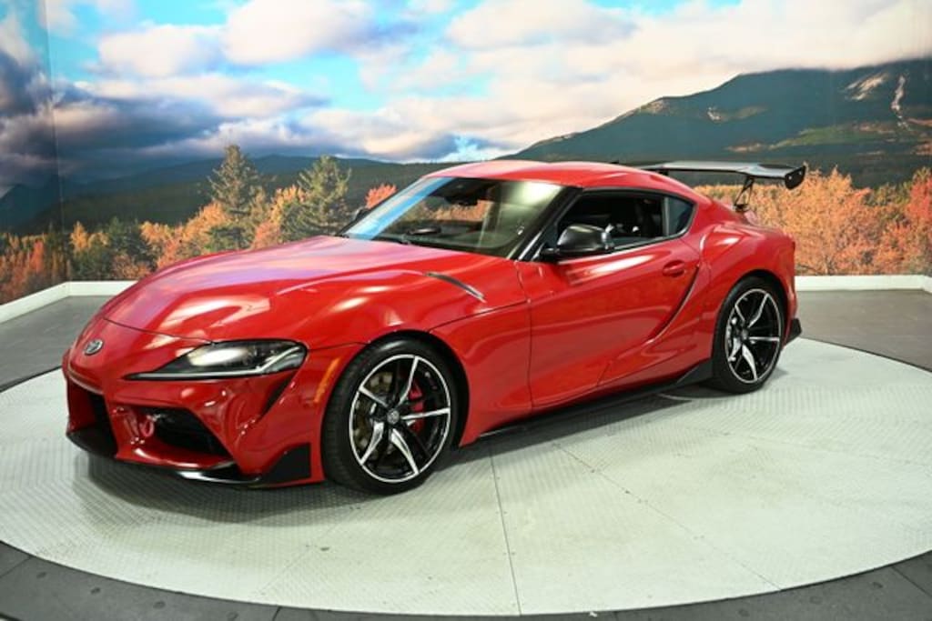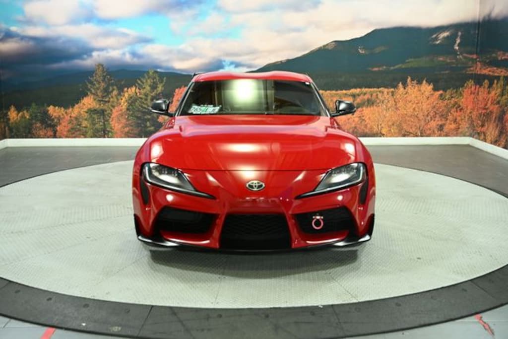 This 2020 Red Toyota Supra 3.0 RWD is well equipped and includes these features and benefits: Premium Launch (Heads-Up Display, Red Brake Calipers, and Red Exterior Mirror Caps), Navigation System, 12 Speakers, 4-Wheel Disc Brakes, ABS brakes, Adaptive suspension, Air Conditioning, Alloy wheels, AM/FM radio: SiriusXM, Apple CarPlay, Auto High-beam Headlights, Auto-dimming door mirrors, Auto-dimming Rear-View mirror, Automatic temperature control, Brake assist, Bumpers: body-color, Child-Seat-Sensing Airbag, Delay-off headlights, Driver door bin, Driver vanity mirror, Dual front impact airbags, Dual front side impact airbags, DVD-Audio, Electronic Stability Control, Emergency communication system, Exterior Parking Camera Rear, Four wheel independent suspension, Front anti-roll bar, Front Bucket Seats, Front Center Armrest, Front dual zone A/C, Front fog lights, Front reading lights, Fully automatic headlights, Garage door transmitter: HomeLink, Heated door mirrors, Heated front seats, Heated Front Sport Seats, Illuminated entry, Knee airbag, Leather Seat Trim, Leather Shift Knob, Leather steering wheel, Low tire pressure warning, Memory seat, Occupant sensing airbag, Outside temperature display, Overhead airbag, Panic alarm, Passenger door bin, Passenger vanity mirror, Power door mirrors, Power driver seat, Power passenger seat, Power steering, Power windows, Radio data system, Radio: 500-Watt AM/FM JBL Audio w/12 Speakers, Rain sensing wipers, Rear anti-roll bar, Rear window defroster, Remote keyless entry, Security system, Speed control, Speed-sensing steering, Speed-Sensitive Wipers, Steering wheel mounted audio controls, Tachometer, Telescoping steering wheel, Tilt steering wheel, Traction control, Trip computer, Turn signal indicator mirrors, Variably intermittent wipers, and Wheels: 19" Forged Aluminum w/Painted Accents. No CARR payments for 4 months, Sign and Drive sales event!, Heads-Up Display, Navigation System, Premium Launch, Red Brake Calipers, Red Exterior Mirror Caps.