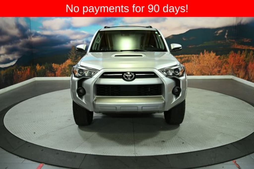 This 2021 Classic Silver Metallic Toyota 4Runner TRD Off-Road Premium 4WD is well equipped and includes these features and benefits: Off Road Premium Package w/Softex (Body Color Heated Mirrors, Garage Door Opener, and Wireless Smart Entry Door Lock), 4WD, Black/Graphite Leather, Moonroof w/Tilt Up & Slide, 3.727 Axle Ratio, 4-Wheel Disc Brakes, 8 Speakers, ABS brakes, Air Conditioning, Alloy wheels, AM/FM radio: SiriusXM, Anti-whiplash front head restraints, Apple CarPlay/Android Auto, Auto High-beam Headlights, Auto-dimming Rear-View mirror, Black Roof Rails, Brake assist, Bumpers: body-color, Compass, Driver door bin, Driver vanity mirror, Dual front impact airbags, Dual front side impact airbags, Electronic Stability Control, Emergency communication system: Safety Connect with 1-year trial, Exterior Parking Camera Rear, Front anti-roll bar, Front Bucket Seats, Front Center Armrest, Front fog lights, Front reading lights, Front wheel independent suspension, Garage door transmitter: HomeLink, Heated door mirrors, Heated Front Bucket Seats, Heated front seats, Illuminated entry, Knee airbag, Leather Shift Knob, Low tire pressure warning, Occupant sensing airbag, Outside temperature display, Overhead airbag, Overhead console, Panic alarm, Passenger door bin, Passenger vanity mirror, Power door mirrors, Power driver seat, Power passenger seat, Power steering, Power windows, Radio: Premium Audio w/Dynamic Navigation, Rear anti-roll bar, Rear seat center armrest, Rear window defroster, Rear window wiper, Remote keyless entry, Roof rack: rails only, Security system, Softex Synthetic Leather Seat Trim, Speed control, Speed-sensing steering, Split folding rear seat, Spoiler, Steering wheel mounted audio controls, Tachometer, Telescoping steering wheel, Tilt steering wheel, Traction control, Trip computer, Turn signal indicator mirrors, Variably intermittent wipers, and Wheels: 17" x 7.5" 7-Spoke Unique Off-Road Alloy. No CARR payments for 4 months, Sign and Drive sales event!, CARR Cares Advantage up to $3100 in ownership savings, TRD Off Road Premium, 4WD, Black/Graphite Leather, Body Color Heated Mirrors, Garage Door Opener, Moonroof w/Tilt Up & Slide, Off Road Premium Package w/Softex, Wireless Smart Entry Door Lock.