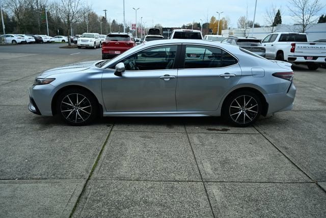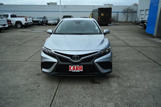 This 2024 Celestial Silver Metallic Toyota Camry SE FWD is well equipped and includes these features and benefits: Black Artificial Leather, 18 x 8J Alloy Wheels, 4-Wheel Disc Brakes, 6 Speakers, ABS brakes, Air Conditioning, Alloy wheels, AM/FM radio: SiriusXM, Apple CarPlay/Android Auto, Auto High-beam Headlights, Automatic temperature control, Brake assist, Bumpers: body-color, Delay-off headlights, Driver door bin, Driver vanity mirror, Dual front impact airbags, Dual front side impact airbags, Electronic Stability Control, Emergency communication system: Safety Connect (1-year trial), Exterior Parking Camera Rear, Four wheel independent suspension, Front anti-roll bar, Front Bucket Seats, Front Center Armrest, Front dual zone A/C, Front reading lights, Fully automatic headlights, Heated door mirrors, Illuminated entry, Knee airbag, Leather steering wheel, Low tire pressure warning, Occupant sensing airbag, Outside temperature display, Overhead airbag, Overhead console, Panic alarm, Passenger door bin, Passenger vanity mirror, Power door mirrors, Power driver seat, Power steering, Power windows, Radio data system, Radio: Audio, Rear anti-roll bar, Rear seat center armrest, Rear side impact airbag, Rear window defroster, Remote keyless entry, Security system, Speed control, Speed-sensing steering, Split folding rear seat, Spoiler, Sport SofTex Seat Trim w/Fabric Inserts, Steering wheel mounted audio controls, Tachometer, Telescoping steering wheel, Tilt steering wheel, Traction control, Trip computer, Turn signal indicator mirrors, and Variably intermittent wipers.